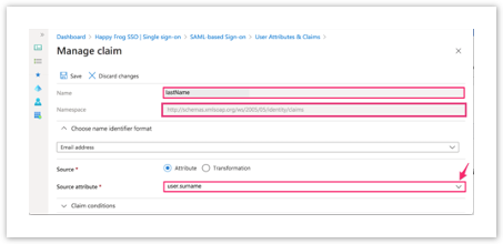 Click on user.surname Delete content in Namespace field Change Claim name to lastName Ensure Source is set to Attribute when editing the claim | ![]() |