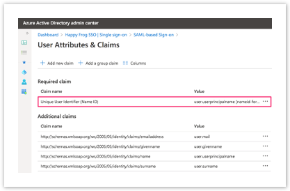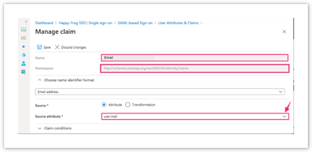 Click on user.mail Delete content in Namespace field Change Name to email Ensure Source is set to Attribute when editing the claim | ![]() |