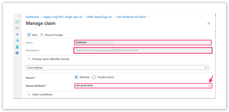 Click on user.givername Delete content in Namespace field Change Claim name to firstName Ensure Source is set to Attribute when editing the claim | ![]() |